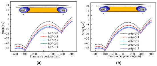 Longitudinal strain distribution on the top surface of the concrete slab for different b/H; (a). L/2 section; (b). L/4 section.