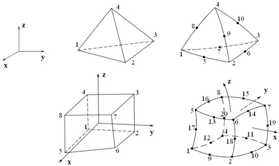 The second analytical approach is to model the slab as a 3D solid, which is meshed using tetrahedral elements with 4 or 10 nodes and/or hexahedral elements with 8 or 20 nodes based on the approximation method used and the structure’s geometry. In these elements, there are three components to the vector of displacements: displacement in the direction of the X-axis (u), displacement in the direction of the Y-axis (v), and displacement in the direction of the Z-axis (w). Therefore, its formulation is {u} = {u, v, w}. Typical 3D FE elements are depicted in Figure 2.