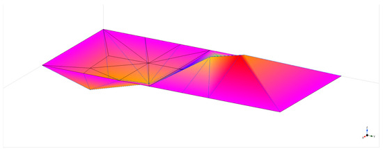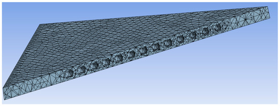 Next, a more complex analysis was carried out using ANSYS Workbench Mechanical 2023 R.2 FEM software. In this case, the slab was modeled in 3D “as is”, using 3D elements (SOLID187, tetrahedral element with 10 nodes; SURF154, 4–8 node surface element [41], maximal element size 0.5 m). The elements used were standard for this type of analysis, and their size was iterated based on their impact on outcomes (i.e., elements were scaled down until the change in results was negligible). In areas with void formers, actual voids were modeled according to shape. A cutout from a 3D model depicting voids in the slab and mesh is provided in Figure 4.