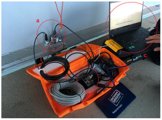 Illustrative photograph of the measurement setup. (a) Accelerometers; (b) transducers; and (c) computer with data-logging software.