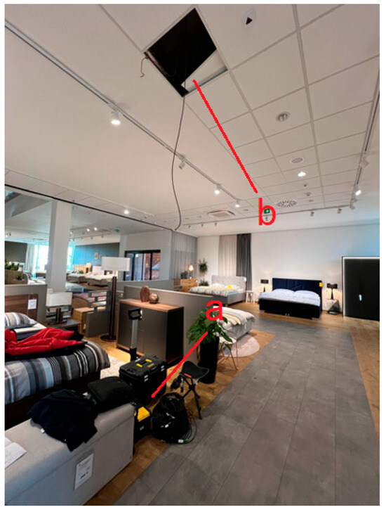 Preparation of measurement campaign. (a) Transducers and computer; (b) accelerometer attached to slab inside of false plasterboard ceiling.
