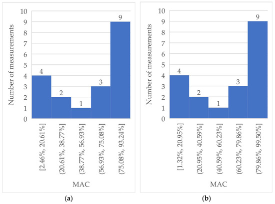 MAC values were obtained for each individual measurement, as the means of excitations were different. The calculated results are visualized in histograms in Figure 11.