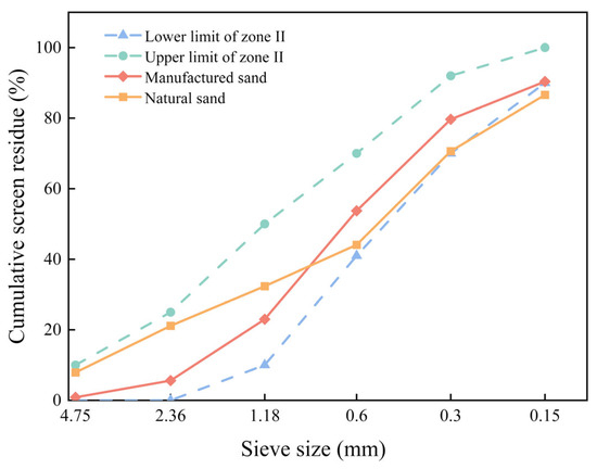 Kavya, and Rao [9] studied the effect of manufactured sand on concrete with different ratios. It was shown that the particle morphology, grading, and stone powder content of MS significantly affects the concrete properties [10,11]. High-performance MSC can be prepared by optimizing the characteristics of MS, adjusting the proportion, and using admixtures. Shen et al. [12] studied the clean production of MS and the case of stone powder recycling. The researchers studied the effect of stone powder on the microstructure of MSC and its permeability [13]. In addition, the effect of stone powder content on the carbonation properties of MSC was also investigated to improve its durability [14]. Researchers used machine learning to optimize the design of concrete and MS ratios [15]. Meng et al. [16] investigated concrete based on MS with different percentages of NS substitution. A database of compressive strength and splitting tensile strength of MSC under multi-factors has been established [17]. Zhen et al. [18] investigated the mechanical properties of glass fiber-reinforced MSC and proposed an intrinsic model. MS has also been used for the preparation of ultra-high-performance concrete (UHPC), with the advantages of low cost and low environmental impact and for the production of reinforced concrete beams in order to study their shear fatigue behavior [19,20]. The use of MS to replace NS as a fine aggregate for the preparation of concrete not only protects environmental resources, but also effectively improves the performance of concrete, and the study of the effect of stone powder content on the performance of concrete can promote the development of MSC.