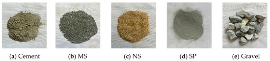MSC is a composite material consisting of cement, MS, NS, stone powder (SP), gravel, water, and water reducing agents. The chemical composition of cement is shown in Table 1. The grading curves of MS and NS are shown in Figure 1. Stone powder is a kind of fine particle by-product produced in the production process of MS, which is mainly composed of tiny particles with a particle size less than 0.075 mm after rock crushing. The morphology of the MSC raw material is shown in Figure 2.