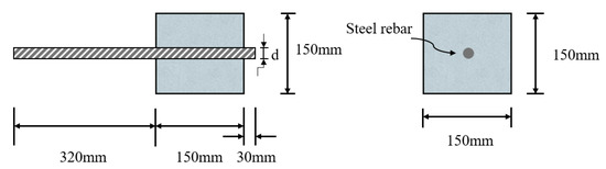 There were seven groups in the experiment. Each group has three cubic specimens (150 mm), and the average value is taken to represent the final result. The steel rebar is embedded in a fully embedded manner, i.e., bond length of 150 mm. A schematic diagram of the pull-out specimens is shown in Figure 3.