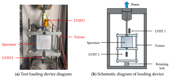 The device used for the center pull-out test was a 1000 kN universal testing machine. Since reinforced concrete specimens cannot be placed directly on the universal testing machine for pull-out, a specific fixture was made. For this test, a displacement transducer was set up at the loading end (LVDT1) and the free end (LVDT2) of the specimen to measure the displacement “ δ L ” at the loading end and “ δ F ” at the free end. The diagram of the test loading device is shown in Figure 4.