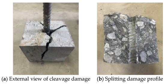 In the pull-out experiments in this paper, there is only one damage mode for the steel bar and MSC, which is splitting damage. The specimen splitting damage is shown in Figure 7. Existing studies have conducted basic mechanical analyses of concrete splitting failure [42], while this paper focuses on the specific effects of three variables.