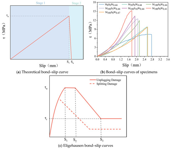 The bond stress–slip curve of the reinforcement and MSC is mainly divided into two stages, as shown in Figure 8a. The first stage is the rising section; the curve in this section rises approximately linearly with a steep slope, reflecting the rapid increase in bond stress with slip. The bond stress reaches the peak bond stress τu, and the bar slip is S1, which is a combination of the chemical bond and mechanical occlusion force between the steel bar and concrete. The second stage is the descending section, which has a sudden drop in curve stress and a slight increase in slip to reach the peak slip Su, which is characterized by brittle fracture, with almost zero residual stress, and the splitting crack runs through the specimen at this stage, with an instantaneous loss of bonding capacity. Figure 8b shows the bond stress–slip curves of each group of specimens in this test and Figure 8c shows the bond stress–slip curve in the ideal case. It can be seen that with the increase in bond stress, the slip also increases, that is, the rising section of the bond stress–slip curve. Finally, when the bond stress increases to the peak bond stress, the bond stress plummets to 0, and at this time, the slip of the reinforcement increases slightly to reach the peak slip. The bond–slip curves derived from the results of this test basically coincide with the Eligehausen bond–slip curves [43]. The difference is that in this test, after the bond stress in the reinforced concrete specimen reaches the maximum value, the specimen undergoes splitting damage, and its bond stress rapidly decreases to 0.