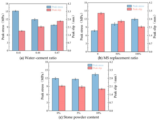 Figure 9 illustrates the effects of the water–cement ratio, MS replacement ratio, and stone powder content on peak bond stresses and peak slip for each group of specimens. For the peak bond stress, when the water–cement ratio decreases from 0.41 to 0.44 and then from 0.44 to 0.47, the peak bond stress of the reinforced concrete decreases from 15.22 MPa to 11.94 MPa to 9.71 MPa, with decreases of 21.55% and 18.68%. And when the replacement rate of the MS increases from 0% to 50% and then to 100%, the peak bond stress increased from 7.72 MPa to 9.86 MPa to 11.94 MPa, with an increase of 27.72% and 21.10%. When the stone powder content increased from 0% to 5% and then to 10%, the peak bond stress of reinforced concrete increased from 11.93 MPa to 12.19 MPa to 13.43 MPa, with an increase of 2.18% and 10.17%.