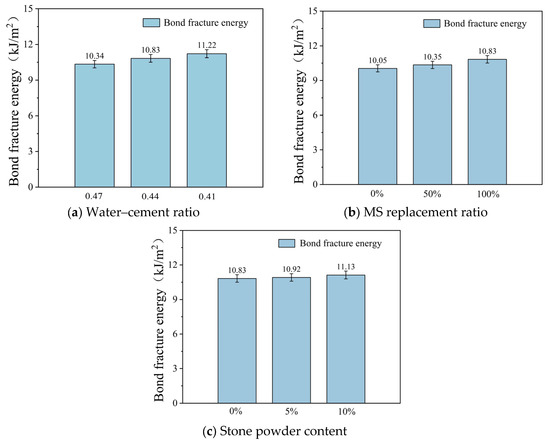 The variations in bond fracture energy between rebar and MSC are demonstrated in Figure 10. Among them, when the water–cement ratio was reduced from 0.47 to 0.44, the bond fracture energy increased from 10.34 kJ/m2 to 10.83 kJ/m2, with an increase of 9.67%. When the water–cement ratio continued to be reduced from 0.44 to 0.41, the bond fracture energy increased from 10.83 kJ/m2 to 11.22 kJ/m2, with an increase of 3.61%. The two increases in the water–cement ratio both resulted in a significant increase in the bond fracture energy, and the bond fracture energy between reinforced concrete was the largest and the bond performance was the strongest when the water–cement ratio was 0.41. This trend aligns with studies on cementitious composites [44], where lower w/c ratios enhance density and interfacial bonding, thereby improving fracture energy.