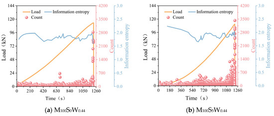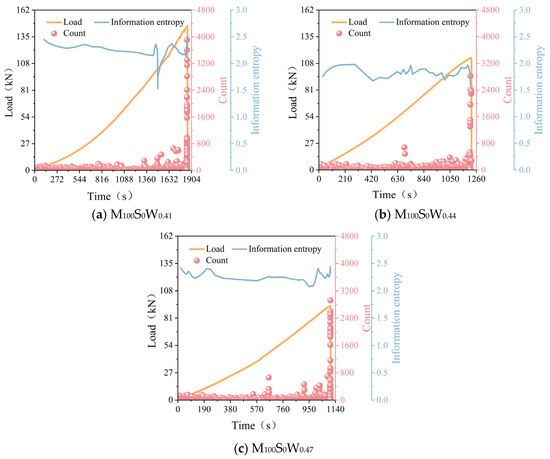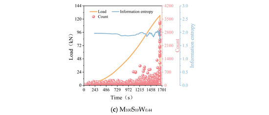 Figure 11 exhibits the count and information entropy of MSC specimens with different water–cement ratios. The count of M100S0W0.41 was kept at a low level during the period of 0–1250 s, and there was no obvious crack inside the MSC. The count increased during the period of 1250–1750 s, and cracks started to appear inside the MSC at this time. Finally, the count was extremely high during the period of 1750–1850 s, reaching the highest value, and then the MSC underwent splitting and damage. The count of M100S0W0.44 was kept at a low level during the period of 0–740 s, and there was no obvious crack inside the MSC. During the period of 740–1130 s, the count was increased, and the crack inside the MSC started to appear. Finally, during the period of 1130–1230 s, the count was very high and reached the highest value, and the MSC underwent splitting damage at this time. The count of M100S0W0.47 was kept at a low level during the period of 0–650 s, and no obvious cracks appeared in the MSC. The count increased during the period of 650–1000 s, and cracks began to appear in the MSC. And finally, the count was very high during the period of 1000–1100 s, reaching the highest value, and then the MSC underwent splitting damage.
