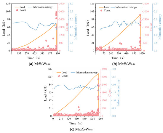 The count and information entropy of MSC specimens with different MS replacement rates are illustrated in Figure 12. The count of M0S0W0.44 remains at a low level during 0–450 s, and there was no obvious crack inside the MSC. The count increased during 450–690 s, and cracks started to appear inside the MSC at this time. And finally, a very high count occurred and reached the highest value during 690–790 s, and then the MSC underwent splitting damage. The count of M50S0W0.44 was kept at a low level during 0–500 s, and no obvious cracks appeared in the MSC. The count increased during 500–890 s, and cracks began to appear in the MSC. Finally, the count appeared at a very high level during 890–990s and reached the highest value, and then the MSC underwent splitting damage. The count of M100S0W0.44 was kept at a low level during 0–750 s, and there was no obvious crack inside the MSC. The count increased during 750–1120 s, and cracks started to appear inside the MSC. Finally, the count was extremely high during 1120–1220 s, reaching the highest value, and splitting damage occurred in the MSC.
