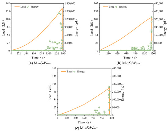 Figure 14 shows the energy produced by MSC specimens with different water–cement ratios during the test. The energy of M100S0W0.41 did not have a large value during the period of 0–1250 s, which was kept at a lower value. And a large amount of energy was generated during the period of 1250–1750 s, at which time a crack was generated inside the MSC. Finally, a large amount of energy was generated during the period of 1750–1850 s, which appeared as the maximum value, and at which time the MSC underwent splitting and damage. The energy of M100S0W0.44 did not have a large value during the period of 0–740 s, which was kept at a lower value. And a large amount of energy was produced during the period of 740–1130 s, at which time cracks were produced inside the MSC. Finally, a large amount of energy was produced during the period of 1130–1230 s, at which time cleavage damage occurred in the MSC. The energy of M100S0W0.47 did not have a large value during the period of 0–650 s and was kept at a lower value. And a large amount of energy was produced during the period of 650–1000 s, at which time a crack was produced inside the MSC. Finally, a large amount of energy was produced during the period of 1000–1100 s, at which time the MSC underwent splitting damage. Totally, the maximum energy produced by the MSC specimens with a 0.41 water–cement ratio was larger than that of the MSC specimens with a 0.44 water–cement ratio, and larger than that of the MSC specimens with a 0.47 water–cement ratio.