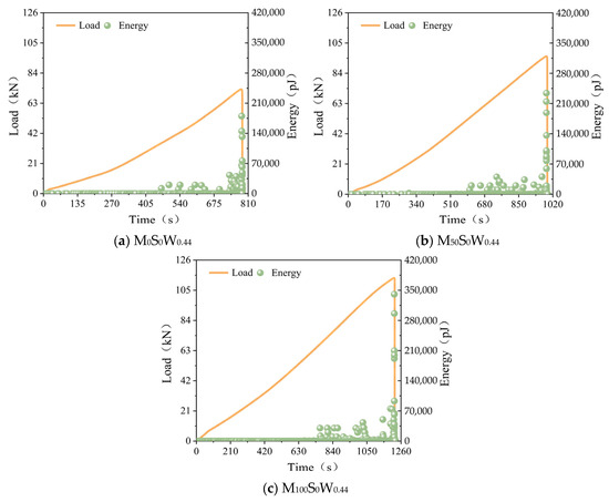 Figure 15 illustrates the energy generated during the test for MSC specimens with different replacement rates of MS. The energy of M0S0W0.44 did not have a large value during the period of 0–450 s and was kept at a lower value. And a large amount of energy was generated in 450–690 s, when cracks were generated inside the MSC. Finally, a large amount of energy was generated, and a maximum value appeared during the period of 690–790 s, when splitting damage occurred in the MSC. The energy of M50S0W0.44 did not have a large value during 0–500 s, which was kept at a lower value. And a large amount of energy was generated during 500–890 s, when cracks were generated inside the MSC. Finally, a large amount of energy was generated in 890–990 s, which appeared as the maximum value, and then the MSC underwent cleavage damage. The energy of M100S0W0.44 did not have a large value during the period of 0–750 s, which was kept at a lower value. And a large amount of energy was generated during 750–1120 s, at which time cracks were generated inside the MSC. Finally, a large amount of energy was generated, and the maximum value appeared during 1120–1220 s, at which time splitting damage occurred in the MSC. Taken together, the maximum energy produced by the MSC specimens with a 100% MS replacement rate was larger than that of the MSC specimens with a 50% MS replacement rate, and larger than that of the MSC specimens with a 0% MS replacement rate.