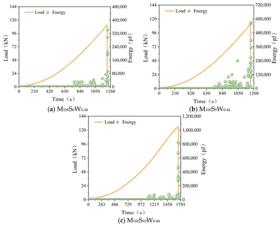 Figure 16 shows the energy generated during the test for MSC specimens with different stone powder contents. The energy of M100S0W0.44 did not have a large value during 0–750 s and was kept at a lower value. And a large amount of energy was generated in 750–1120 s, when cracks were generated inside the MSC. Finally, a large amount of energy was generated during 1120–1220 s, with a maximum value, when the MSC was split and damaged. The energy of M100S5W0.44 did not have a large value during the period of 0–720 s and was kept at a lower value. And a large amount of energy was generated during 720–1120 s, when cracks were generated inside the MSC. Finally, a large amount of energy was generated, and a maximum value appeared during the period of 1120–1220 s, at which time cleavage damage occurred in the MSC. The energy of M100S10W0.44 did not have a large value during the period of 0–1100 s, which was kept at a lower value. And a large amount of energy was generated in 1100–1550 s, when cracks were generated inside the MSC. Finally, during 1550–1650 s, a large amount of energy was generated, and a maximum value appeared, when splitting damage occurred in the MSC. All in all, the maximum energy produced by the MSC specimens with a 10% stone powder content was greater than that of the MSC specimens with a 5% stone powder content and greater than that of the MSC specimens with a 0% stone powder content.