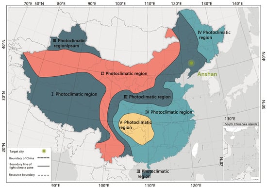 In this study, a primary school in Anshan city, Liaoning Province, China, which is in a Type III light climate zone, was selected for fieldwork (refer to Figure 1). The region has relatively short daylight hours in winter and stable natural light irradiation, which is typical of northern low-light daylight, providing an ideal background for studying the potential effects of extreme light environments on classroom lighting and students’ cognitive behaviours. To enhance the representativeness of the data and rigour of the experimental design, the measurements were conducted around the winter solstice, which is the time of the year with the lowest solar altitude angle and the shortest duration of sunlight, to simulate the most unfavourable natural lighting conditions throughout the year [50].