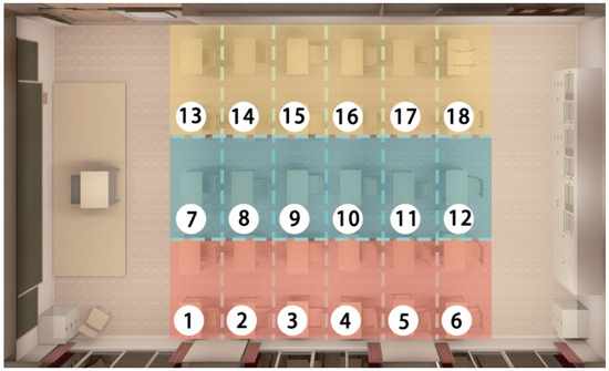 The classroom was divided into zones based on the measurement points, with each zone corresponding to a unique numerical number. Depending on the seating arrangement of the classroom, the length and width of the classroom plane were divided into six and three equal parts, respectively, yielding a total of 18 zones, with the centre of each zone designated the measurement point (refer to Figure 2). The measured illuminance and colour temperature data were plotted as line graphs, and the data presented in the line graphs (refer to Figure 3) revealed significant differences in the distributions of illuminance and colour temperature between the different measurement points in the classroom. The highest levels of illuminance and colour temperature were found at the measurement points close to the window side. The illuminance and colour temperature of the desktop area at positions 15 and 16 were significantly higher than those of the other areas in the classroom. Comparatively, several measurement points away from the windows and adjacent to the front and rear ends of the classroom had lower illuminance levels, particularly at positions 1, 6, 7, 12, 13, and 18, where the measured illuminance value was only 280 lux, which failed to meet the minimum illuminance requirements recommended by national or international classroom lighting standards [51].