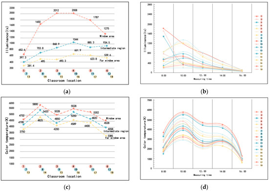 Classroom point illuminance and CCT line chart: (a) line chart of illuminance at different positions; (b) line chart of illumination at different times; (c) line chart of CCT at different positions; (d) line chart of CCT at different times.