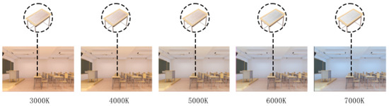 To choose the appropriate colour temperature value for the experiment, we referred to previous studies [59,60,61,62], and the colour temperature range was 3000–8000 K, which was too low for the natural lighting condition to be achieved and too high for the students to learn normally. In addition, in the pre-experiment conducted to select the increment of colour temperature, when the increment of colour temperature was 500 K, the subjects did not experience sensory or visual changes in response to changes in colour temperature; therefore, the increment of colour temperature was set at 1000 K. Combined with the above research and measurement of the classroom, the experimental gradient values of the colour temperature of this experiment for the experiment were 3000, 4000, 5000, 6000, and 7000 K, and the colour temperature was set at 3000, 4000, 5000, 6000, and 7000 K (refer to Figure 4). Based on the literature review, an illuminance of 500 lx was considered a more comfortable value of colour temperature and was maintained throughout the study. To achieve the target horizontal illuminance of 500 lx on the desktop, the combination of curtain position and artificial lighting intensity was adjusted before each test session. A professional illuminance meter was used to confirm that the measured illuminance matched the experimental preset value. This process ensured that the lighting environment across all CCT conditions was consistent and met visual comfort standards, reflecting a realistic but well-controlled classroom setting.