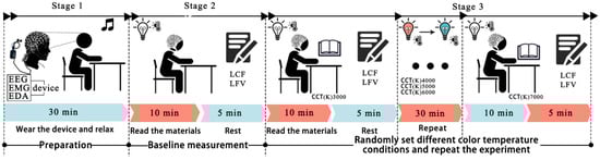 The experimental process of this study was divided into four stages. In the first stage, the subjects were introduced to the experimental process and informed accordingly while wearing physiological signal acquisition equipment to ensure the accuracy and stability of data acquisition (refer to Table 5). In the second stage, before starting the task, the subjects were first adjusted to the resting state, and their basic physiological indexes were then recorded. The reading task was performed at a colour temperature of 3000 K, which was controlled by an adjustable light source and fine-tuned according to the height, size, and gender of the individual to ensure consistency of the light experience. In the third stage, the participants completed a series of standardised cognitive tasks covering attention maintenance, reaction speed, and short-term memory under the same light conditions, and physiological response data were collected. In the fourth stage, the participants were asked to complete a subjective perception questionnaire at the end of the tasks to assess their satisfaction and visual comfort with the current light situation. Each participant underwent a full cycle of testing under all five CCT conditions (3000 K–7000 K). For each lighting condition, the total exposure time was approximately 25–30 min, including a 5-min adaptation period, 15–20 min of cognitive task execution during which EEG and EDA signals were recorded, and a short subjective assessment. A 10-min rest period was provided between lighting conditions to reduce fatigue and physiological carry-over effects; the colour temperature level was randomly changed, and the above process was repeated (refer to Figure 5).