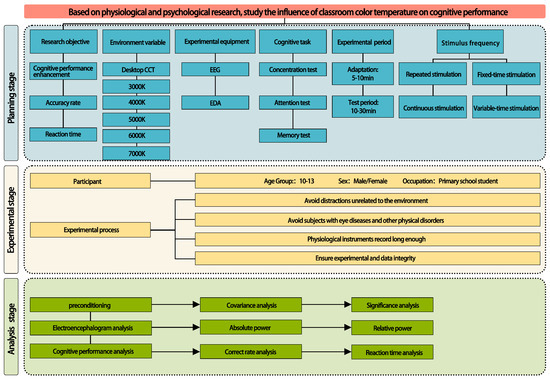 In the design of contemporary educational spaces, researchers are increasingly focusing on classroom lighting environments as important physical elements that affect the learning efficiency and health of students. Primary school classrooms are the primary learning environments for students aged 7–12 years, a critical period for eye development and physiological changes that differ from those in other age groups. Statistics show that primary school students spend more than seven hours per day in classrooms, where more than 87% of the information relies on visual input [1]. Visual perception in these classrooms is largely influenced by the lighting environment, which involves the physiological and psychological effects of light in the environment. In recent years, researchers have increasingly focused on improving classroom light quality [2], such as classroom illuminance, colour temperature, illuminance uniformity, and glare. More research is needed to design and standardise the quality of classroom environments from the perspective of improving students’ cognitive performance [3]. In recent years, research on the relationship between indoor built environments and human cognitive performance has received increasing attention.