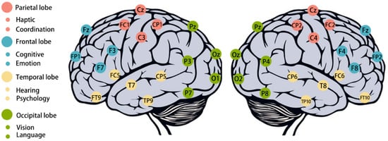 To further explore the effects of illumination changes on brain functions, EEG signals were collected simultaneously and showed clear nonstationary characteristics, and their channel settings were divided based on the principles of functional and anatomical partitioning of brain regions. The cerebral cortex can be divided into four main regions: frontal, parietal, occipital, and temporal lobes, of which the frontal region is mainly responsible for thinking and emotion regulation; the parietal and occipital lobes are involved in perceptual, attentional, and linguistic functions; the occipital lobe dominates visual processing; and the temporal lobe reflects auditory perception and synthesises sensory information [67,68] (refer to Figure 9). Experiments were conducted using 32 partitioned channels connected to the EEG instrument, and five common frequency bands (δ, θ, α, β, and γ) were extracted to characterise the EEG activity (refer to Table 6). These frequency bands reflect different cognitive states and brain energy consumption patterns. When an individual is engaged in a cognitive task or processing of external stimuli, the nervous system is activated with a subsequent increase in energy expenditure; in contrast, in a state of low cognitive load and subjective comfort, the level of energy consumption is relatively low [69,70,71].