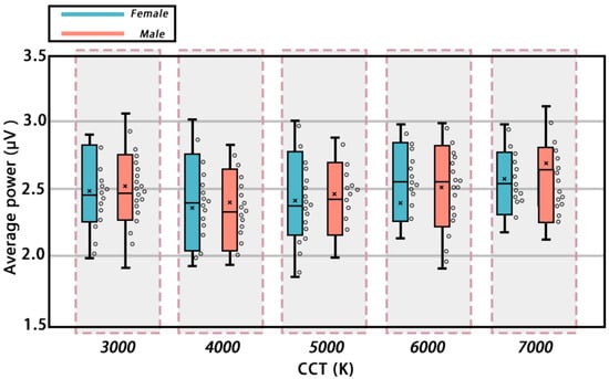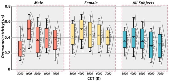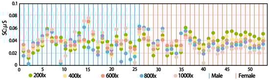 This result suggests that the changes in skin conductance exhibited by students during the reading task in different colour temperature environments were significantly influenced by their individual baseline status. The study also analysed the data grouped by gender and found that the female participants at the primary school level exhibited significantly higher skin conductance indices than males under the same colour temperature conditions and that these indices were above the overall average (refer to Figure 11). This suggests that gender differences may also play a moderating role in the relationship between the visual environment and physiological responses.