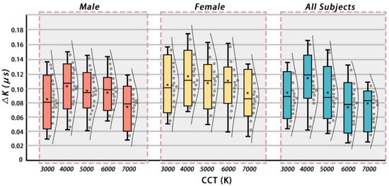 To control the interference of individual skin electrical baseline values on the experimental results, a standardisation method was introduced in the data processing stage of this study. The corresponding baseline values were subtracted from the mean time-domain values of skin conductance obtained from each subject under the experimental conditions, and the difference was subsequently divided by the baseline value to calculate the relative rate of change Δk, which was used to measure the physiological arousal levels of individuals under different colour temperature conditions. By analysing and summarising the Δk values under different colour temperature conditions, the arousal trends under different colour temperature levels can be understood (refer to Figure 12). The highest arousal level was reached under the colour temperature condition of 4000 K; when the colour temperature level exceeded 4000 K, the arousal level decreased significantly (refer to Table 11).