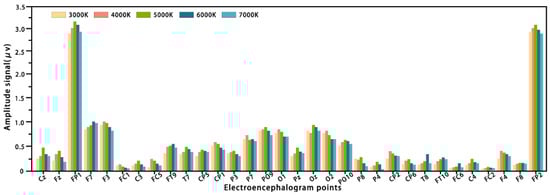 Owing to the development of techniques for measuring physiological metrics, which can provide researchers with the comfort level perceived by subjects in different light environments, previous studies have confirmed the relationship between light environment characteristics and physiological metrics [12,13,14,15,16,17]. Viola et al. [18] introduced illumination at an ultrahigh colour temperature of 17,000 K in a natural office and teaching space and found that by monitoring cortisol saliva samples, high CCT conditions enhanced morning cortisol responses and contributed to work motivation and cognitive mobilisation. With the deepening of research at the intersection of neuroscience and environmental psychology, the electroencephalogram (EEG), a noninvasive physiological monitoring technique, has been widely used in studies that assess the effects of indoor environments on the cognitive performance of individuals. Chellappa et al. [19] used multichannel EEGs to record students’ wakefulness and alpha-wave frequency activity under different CCT lighting conditions, and the results revealed that a high-colour-temperature light source significantly elevated cortical excitation levels, reflecting greater cognitive alertness. Zhang et al. [20] systematically reviewed the progress of research using EEG monitoring techniques to explore the relationship between lighting environments and cognitive activity and noted that EEG metrics are able to objectively record the brain’s electrical activity patterns under different light environment conditions, thus providing a physiological basis for the subjective evaluation of lighting quality. Walter et al. [21] used EEG waveform analysis to reveal the potential neural mechanisms of colour temperature in modulating attention, working memory, and learning efficiency, among others, and showed that environmental stimuli can modulate individual cognitive performance by influencing cortical electrical activity. Hu et al. [22] found that the higher the levels of comfort and satisfaction in a lighting environment, the lower the average power required for concussive brain activity. Eroğlu et al. [23] found that the illumination environment significantly affects the mean power in the occipital and parietal lobes. The EEG mean power has been shown to be an effective indicator for studying the effect of the illumination environment on brain activity, which is nonlinear and unstable [24]. EEG signals have been widely used in recent studies to assess the quality of the built environment. Table 1 lists relevant studies that used EEGs to investigate the built environment. Unlike previous studies, the present study used EEGLAB as an EEG analysis tool in conjunction with subjective ratings of fatigue and satisfaction of primary school students during cognitive testing. To effectively visualise brain activity, objective brainwave states and subjective cognitive evaluations were visualised during the measurement of students’ cognitive performance.