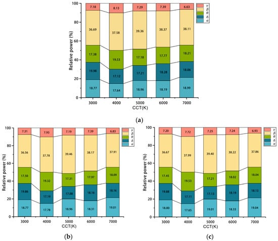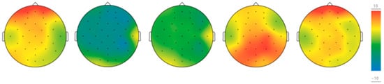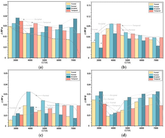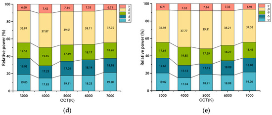 To quantify the EEG activity in each frequency band, this study used the short-time Fourier transform with a 1-s nonoverlapping time window to extract the power spectral density features of the five frequency bands, using Equations (1)–(3), and combined it with the wavelet transform method to calculate the absolute power. The total power was obtained by accumulating the AP values of the five frequency bands, and the relative power, which represents the ratio of the AP to the total power of each frequency band, was used to reflect the distribution characteristics of the EEG energy [72]. The effects of lighting conditions on students’ cognitive states and brain energy levels were comprehensively analysed using the above methods.