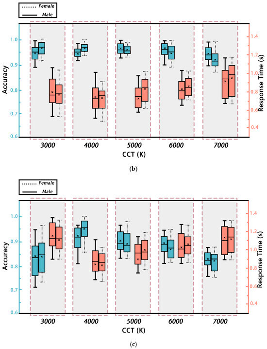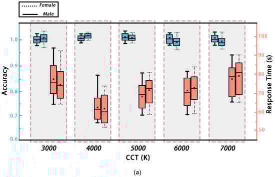 - The cognitive performance of males was higher than that of females in the warm colour temperature lighting environment, while females had higher cognitive performance than that of males as the colour temperature increased and the colour temperature environment became cooler.