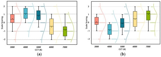 Several studies have revealed that the relevant colour temperature, as a key parameter characterising the colour-sensitive properties of light sources, is widely used to assess the comfort and functional suitability of indoor light environments. Numerous studies have noted that colour temperature not only affects human visual perception and spatial preference but also profoundly affects cognitive behaviour by modulating circadian rhythms and nonvisual physiological responses. Sun et al. [4] conducted various cognitive tests, including perception, memory, thinking, and executive functions, in an environment with a light intensity of 100–2500 lx and colour temperature value of 2700–6500 K. Zeng et al. [5] measured three types of productivity (namely, arithmetic, memory, and perception) based on CCT in environments with light intensities of 4000–10,000 K. Kruithof [6] examined perceptions of combinations of CCT and illuminance levels and found that people preferred combinations of high CCT with high illuminance levels, as well as combinations of low CCT and low illuminance levels. Several laboratory-controlled studies and field-intervention studies have shown that colour temperature modulation can significantly affect student performance in specific cognitive tasks [7]. In a field study conducted in Dutch primary schools, Sleegers et al. [8] found that students’ reading comprehension, mathematical problem solving, and classroom concentration significantly improved under dynamically adjustable colour temperature lighting (3500–6500 K). CCT has been shown to significantly affect individuals’ subjective comfort and light environment preferences [9]. The results of several experiments have revealed that differences exist in individual preferences for different combinations of CCT and illumination levels and that such preferences are not only affected by the light parameter but also closely related to the specific type of activity in which the subject is engaged [10,11]. For example, when performing tasks such as reading, writing, or cognitive processing, subjects show a stronger acceptance of higher CCT and higher illuminance combinations, whereas light environments with lower CCT and lower illuminance are preferred in resting or relaxation situations.