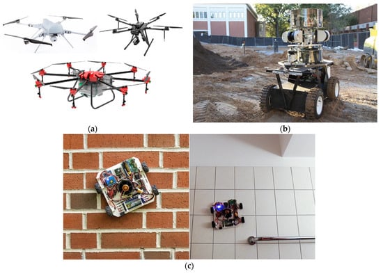 Robotic technologies in construction: (a) UAVs [], (b) mobile ground vehicles [], and (c) wall-climbing robots [].