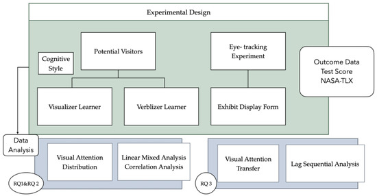 To investigate the proposed research questions, a quasi-experimental design was employed (Figure 1). Participants completed a controlled viewing task under different exhibit display conditions during which both eye-tracking data and self-report questionnaires were collected. The analysis focused on examining the relationships among participants’ cognitive styles (visualizer vs. verbalizer), the complexity level of exhibit display formats, knowledge acquisition, cognitive load (as measured by recall performance and perceived task difficulty), and visual attention metrics (including total dwell time and fixation count). Furthermore, lag sequential analysis (LSA) was applied to compare the visual transition pattern of visualizer and verbalizer participants while viewing an exhibit.