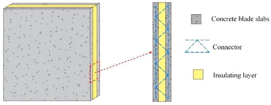 The current design of envelope wall panels is typically classified based on the presence and location of the insulation layer into single-material, interior-insulated, and exterior-insulated panels. However, these traditional insulation systems exhibit significant shortcomings in thermal performance, and both interior and exterior insulated panels are prone to insulation detachment and other safety issues, thereby impeding the advancement of energy-efficient and green-building practices. In contrast, composite sandwich wall panels integrate an insulation material within the concrete core, employing an intermediate insulation core to separate the inner and outer concrete skins. This configuration effectively reduces thermal losses due to alternating temperature gradients while fully leveraging the advantages of each constituent material, thus achieving a synergistic optimization of thermal insulation and structural performance. In a typical prefabricated composite sandwich wall panel (Figure 1), the inner and outer concrete skins are interconnected by preformed connectors, ensuring an integrated and stable structural system.