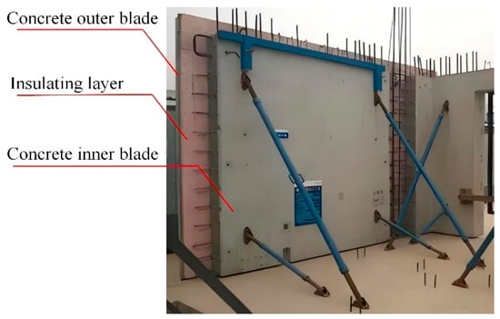 In recent years, an increasing number of new structures have emerged [1]. The application of prefabricated components has emerged as a hallmark of architectural industrialization. However, rising concerns regarding energy consumption and carbon emissions have accompanied this progress. In the carbon emission accounting of prefabricated components, building materials contribute over 95% of the total emissions, making the reduction of material usage a key strategy for carbon reduction [2]. Recent research on prefabricated construction has predominantly focused on the optimization and innovation of structural components, with extensive investigations covering material properties, connection techniques, and load-bearing capacities, all aimed at enhancing the overall performance of buildings [3]. Enclosure wall panels, which serve as core components in prefabricated buildings, perform the dual functions of structural support and thermal insulation. Consequently, the design and performance evaluation of these systems have become critical. In recent years, research on wall panels has evolved along two principal directions: one emphasizes material composition by testing various combinations of insulation and reinforcement materials to achieve an optimal balance between mechanical performance and thermal insulation, while the other analyzes the structural behavior of these panels under different loading conditions, including axial, bending, and seismic loads. For instance, Mustafaraj reinforced precast shear walls using polypropylene short fibers and meshes, demonstrating that the incorporation of polypropylene fibers significantly improved the in-plane load-carrying capacity of the masonry [4]. In another stream, David. C. Salmon comprehensively evaluated the mechanical performance of concrete composite sandwich panels and proposed a formula to accurately estimate panel deflections [5]. Joseph JDR’s experimental work revealed that the type of bending load markedly influences the flexural performance of sandwich panels and validated a predictive model for the ultimate bending capacity [6]. Ashraf A found that sandwich panels could effectively replace solid slabs to enhance structural performance, with experimental results closely aligned with numerical simulations [7]. Moreover, Benayoune A demonstrated that by optimally configuring truss-type steel connectors, the synergistic action between the interior and exterior concrete layers of sandwich panels can be achieved, endowing the panels with ductile failure characteristics as they approach ultimate load [8,9].