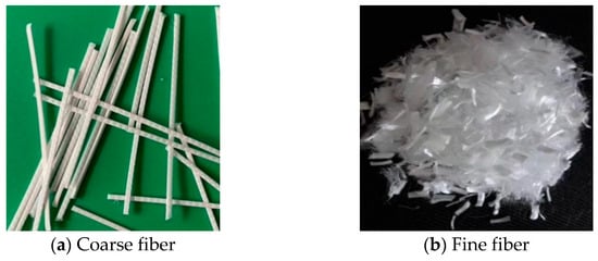 In this study, reference was made to the “Technical Code for the Application of Fiber Reinforced Concrete” (JGJ_T 221-2010) [24] and other standards [25,26]. According to these guidelines, incorporating a certain quantity of synthetic fibers into ordinary concrete does not require an adjustment of the mix proportions. Moreover, report ACI544.1R-96 issued by the American Concrete Institute (ACI) recommends that the fiber volume fraction should be less than 2%. Related research has indicated that even under the 2% limitation, it is imperative to ensure effective vibration during the concrete mixing process [27]. Therefore, the volume fraction of coarse polypropylene fibers was set at three levels: 0.5%, 1%, and 1.5%, and two fiber lengths (30 mm and 50 mm) were considered. Given that fine fibers primarily act to control the formation of initial microcracks, the dosage and length of the fine fibers were maintained constant. A review of multiple studies on polypropylene fiber-reinforced concrete reveals that the dosage of fine polypropylene fibers is generally maintained below 2 kg/m3; excessive fiber content may result in an overly dense distribution within the concrete, insufficient cement paste encapsulation, and increased internal defects [28]. According to the “Technical Code for Fiber Reinforced Concrete Structures” [29] and relevant literature, the recommended dosage of fine fibers is 0.1%. In addition, if the fibers are too short, the anchorage provided by the fibers to the concrete matrix is inadequate for inhibiting crack propagation; conversely, excessively long fibers tend to agglomerate, which is detrimental to their strength. Consequently, the volume fraction of fine fibers was selected as 0.1% with a length of 12 mm.