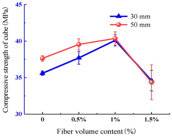 - The experimental results indicate that the mechanical properties of concrete initially increase and then decrease with increasing fiber content. Within the range studied, when the coarse fiber content was 1% and the fiber length was 30 mm, the compressive strength, splitting tensile strength, and flexural strength of the specimens increased by 12.6%, 29.8%, and 44.5%, and each index of concrete specimen reached its best. Respectively, compared to plain concrete. However, when the fiber content was increased to 1.5%, agglomeration phenomena occurred, leading to a marked deterioration in the overall performance.