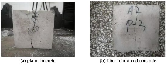 Figure 4 illustrates the failure modes of both the plain concrete and polypropylene fiber-reinforced concrete specimens under compressive loading. The plain concrete specimens (Figure 4a) developed several diagonal cracks in the early stages of loading; as the load increased, the crack widths progressively widened, eventually resulting in the detachment of large areas of concrete fragments and localized conical crushing, which is indicative of a brittle failure. In contrast, the concrete specimens incorporating polypropylene fibers (Figure 4b) generated distinct audible signals during loading due to fiber pull-out or rupture; the onset of cracking was notably delayed, and although the number of cracks increased with the applied load, the crack widths did not change significantly. The polypropylene fibers acted in a manner analogous to transverse reinforcement, effectively maintaining the overall integrity of the specimen and leading to a failure mode characterized by “cracking without complete disintegration.”