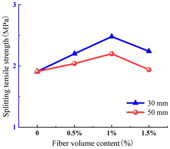 Data depicted in Figure 7 further demonstrates a significant positive effect of polypropylene fiber incorporation on the splitting tensile strength of concrete. This improvement is attributed to the bridging action of the fibers, which effectively share the tensile load when microcracks develop in the concrete matrix, thereby enhancing the overall tensile capacity. Overall, with an increasing fiber volume fraction, the splitting tensile strength initially increases and subsequently decreases; an excessive fiber content induces fiber balling and reduces mixing uniformity, consequently exacerbating the inherent defects in the concrete matrix and limiting the beneficial effects.