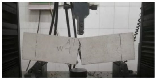 In this study, beam specimens measuring 100 × 100 × 400 mm were used, with three specimens per group and a total of seven groups, to evaluate the flexural performance of concrete. The test was conducted in accordance with the “Test Methods for Fiber Reinforced Concrete” [25], using a CM-T5105 universal testing machine with a span of 300 mm under a three-point bending setup. During the test, displacement-controlled loading was implemented: an initial loading rate of 0.1 mm/min was adopted until peak load was reached, after which the loading rate was increased to 0.5 mm/min until the deflection reached approximately 3 mm. Load–deflection data were automatically recorded by a computer throughout the test.