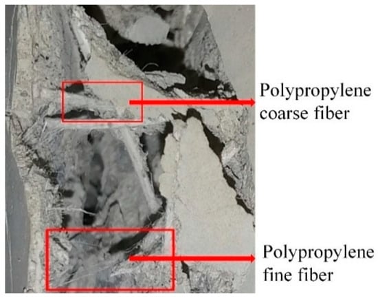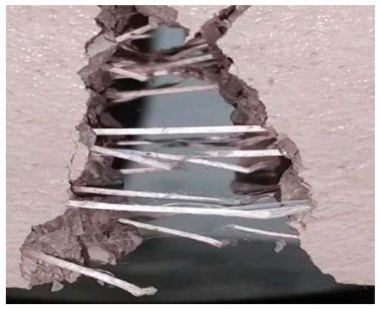 In contrast, the fiber-reinforced concrete beams incorporating polypropylene fibers did not exhibit any obvious cracking during the initial loading phase; cracks appeared abruptly near the peak load, accompanied by a low-frequency, dull sound. With continued loading, a fiber-bridging mechanism was observed along the crack, where fibers effectively carried and redistributed the tensile forces across the crack until they were eventually pulled out or fractured (Figure 9). Furthermore, the incorporation of fibers significantly delayed crack propagation; even after the specimen reached an approximate deflection of 3 mm and was subsequently replaced, the upper portion of the crack remained connected, and the overall integrity of the beam was maintained (Figure 10). This indicates that the inclusion of polypropylene fibers markedly enhanced the deformation capacity and toughness of the specimen, thereby providing an early warning before failure and extending the time available for a safe response.