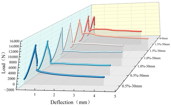 Analysis of the load–deflection curves for the various beam specimens (Figure 11) reveals that plain concrete beams exhibit a precipitous drop in load-carrying capacity after reaching the peak load, resulting in brittle failure. In contrast, beams with added polypropylene fibers, while showing a noticeable reduction in load-bearing capacity post-peak, retain a certain residual strength, with the latter portion of the curve tending to level off. As the fiber volume fraction increases, the residual strength gradually improves, whereas the fiber length has a negligible effect on residual strength. These results demonstrate that the incorporation of polypropylene fibers not only enhances the flexural strength of concrete but also significantly improves its toughness.