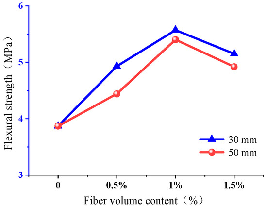 Figure 12 illustrates that the trend of flexural strength variation with fiber volume content is consistent for different fiber lengths, with the optimum fiber content and length being 1% and 30 mm, respectively. Specifically, under the condition of 30 mm fiber length at 1% content, the flexural strength of the specimens increased by 44.5%, whereas for 50 mm fibers at 1% content (group A4), the increase was only 40%. Similarly, at a fiber content of 1.5%, the enhancement effect of 50 mm fibers was inferior to that of 30 mm fibers.