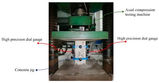 The experiment employed standard prismatic concrete specimens with dimensions of 150 mm × 150 mm × 300 mm, with three specimens per group for a total of seven groups. The test was conducted on a YAW-5000 electro-hydraulic servo pressure machine (500-ton capacity) under displacement-controlled uniaxial compression. As illustrated in Figure 13, the loading setup involved a thorough pre-treatment process—including cleaning the surfaces of both the specimen and the press platens—and precise centering of the specimen to ensure a purely axial loading state, thereby eliminating any eccentricity-induced errors. Axial deformation was measured in real time using electronic dial gauges with a 12.7 mm range, and the deformation was determined by averaging the readings from two gauges. During loading, as the specimen approached failure and the rate of deformation increased, a constant loading rate was maintained until complete failure occurred, enabling the capture of the entire stress–strain curve.