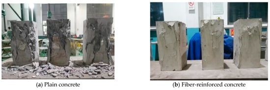 Figure 14 presents a comparison between plain concrete and polypropylene fiber-reinforced concrete specimens after axial compression. Under axial loading, the plain concrete specimens exhibited few cracks during the initial stage; however, once cracking initiated, the cracks rapidly expanded in both length and width, leading to sudden failure accompanied by the detachment of numerous fragments, thus displaying a distinctly brittle failure mode (Figure 14a). In contrast, the addition of polypropylene fibers resulted in the formation of multiple cracks without obvious detachment of concrete fragments. The fiber bridging mechanism maintained the overall integrity of the specimen after failure. During loading, the specimens emitted persistent cracking sounds, and the gradual progression of crack widths, along with the continuous generation of new cracks, indicated that the inclusion of polypropylene fibers significantly enhanced the ductility of the concrete (Figure 14b).