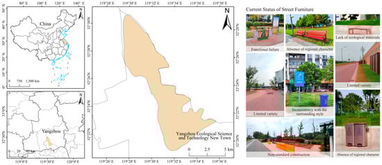 Yangzhou is located in central Jiangsu Province and is one of the first 24 cities designated as National Historical and Cultural Cities in China. The Yangzhou Ecological Science and Technology New Town, established in 2013, is situated at the intersection of the Yangzhou and Guangling urban areas, and has been positioned by the municipal government as the city’s ecological, transportation, innovation, and urban development hub. At present, the new town comprises three major functional zones: the Fenghuang Island Tourism and Resort District in the north (ecological center), the Wanfu business district in the central area (urban core), and the Hangji High-Tech Industrial Zone in the south, known, respectively, as the “Toothbrush Capital of China” and the “Hotel Supplies Capital of China” (Figure 1). Against the backdrop of accelerated integration of ecological, technological, and cultural development, the demand for street furniture—as a vital component of public urban space—has become increasingly diverse, with varying user needs emerging across different functional contexts and demographic groups [47]. However, current street furniture planning in the new town lacks alignment with the overall urban master plan, leading to inconsistencies in style, weak identity recognition, and limited user-centered considerations—factors that collectively hinder the public’s experience [48]. Therefore, evaluating the current street furniture design in Yangzhou Ecological Science and Technology New Town holds both representational and demonstrative value, offering insights and guidance applicable to similar new towns and emerging urban districts.