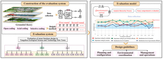 First, taking the Yangzhou Eco-Tech New Town as a case study, we conducted field investigations and in-depth interviews, and integrated grounded theory with the Delphi method to extract key design elements and construct a street furniture design evaluation index system. Second, a combined quantitative approach using the Analytic Hierarchy Process and Fuzzy Comprehensive Evaluation was applied to systematically analyze the importance and satisfaction evaluations of street furniture from multiple stakeholders, including residents, tourists, and government administrators. This approach helped identify the key characteristics and design pain points related to planning, construction, management, and operations. Finally, based on the evaluation outcomes and practical demands, actionable optimization strategies and design guidelines for street furniture systems were proposed (Figure 2).