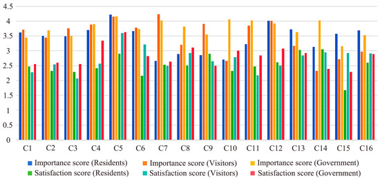 Satisfaction and importance ratings of street furniture in Yangzhou Eco-Tech New Town by different stakeholder groups.