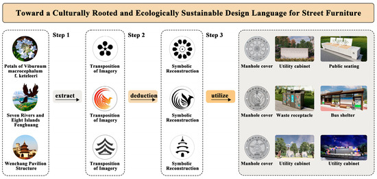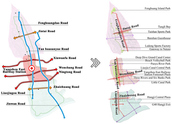 First, based on extensive field investigations and spatial structure analysis, this study proposes an initial concept for the “spatial planning structure of street furniture in the Eco-tech New Town” and, in combination with the town’s functional zoning and transport network, develops a multidimensional layout model described as “one core, two belts, three zones, five axes, and multiple nodes.” Specifically: (1) “one core” refers to a priority configuration zone centered on the Yangzhou East Railway Station, intended to serve as a demonstrative and guiding example; (2) “two belts” indicate furniture installation corridors along Phoenix Island Road–March Blossom Road–Liaojia Canal Road and Jinwan Road; (3) “three zones” correspond to the Wanfu Business District, Phoenix Island Ecotourism Resort, and Hangji High-tech Development Zone within the Eco-tech New Town, with street furniture types allocated according to each area’s functional characteristics; (4) “five axes” align with the main traffic arteries—Jintai Road, Xinwanfu Road, Wenchang Road, Ning-Tong Road, and Zhaizhuang Road—to increase service density in transit-oriented scenarios; and (5) “multiple nodes” focus on crowd-gathering spaces, such as parks and squares, where high-frequency-use furniture is installed. Furthermore, to enhance the rationality of street furniture placement, on-site surveys, behavioral observations, and spatial feature analyses were conducted across the three zones to identify the main pedestrian activity axes and functional nodes. This process yielded a “cross-axis” furniture layout for each zone: Phoenix Island Road–Jintai Road, March Blossom Road–Wenchang Road, and Shuguang Road–Zhaizhuang Road (Figure 4). The specific locations and types of street furniture were determined from survey data and spatial analyses: first, identifying road hierarchy, crowd concentration areas, and high-frequency activity points; second, assigning functional categories of furniture (e.g., seating, wayfinding, display) according to surrounding land uses, and, finally, arranging furniture in an orderly manner along the designated axes based on layout principles, thereby achieving precise alignment between furniture provision and contextual needs.